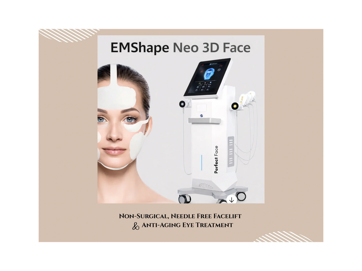 PERFECT FACE NEO and EMFACE are advanced, non-invasive facial rejuvenation technologies that combine radiofrequency (RF) and electrical muscle stimulation to lift, sculpt, and tighten the face without needles or surgery